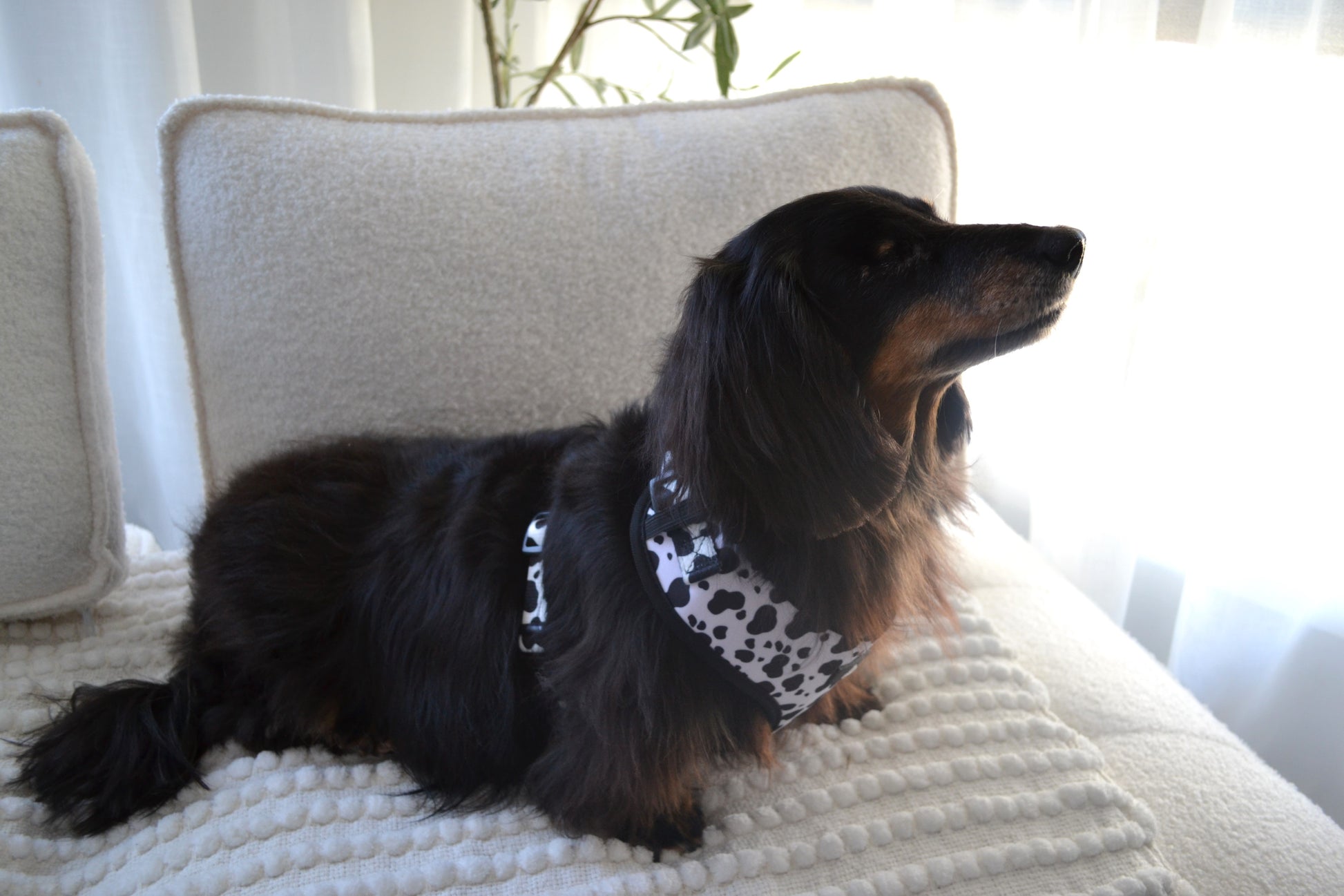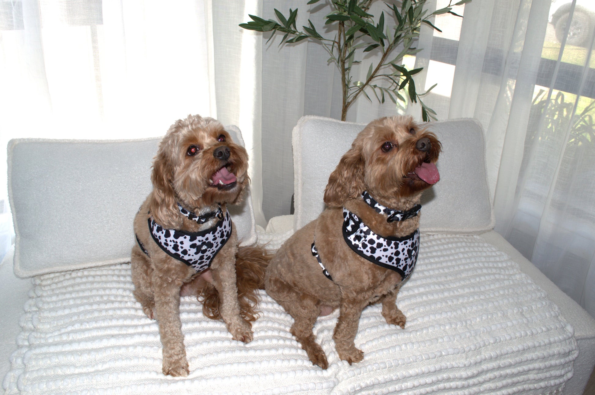Dress your pup in style with the Complete Cow Print Bundle, designed specifically for smaller breeds like mini dachshunds, toy cavoodles, and small oodles. This set includes a matching harness, lead (2.4m), collar, and poop bag holder, all featuring a bold black-and-white cow print pattern. Each item is durable, adjustable, and crafted for comfort during every adventure. Perfect for adding a touch of charm to your dog’s daily walks!