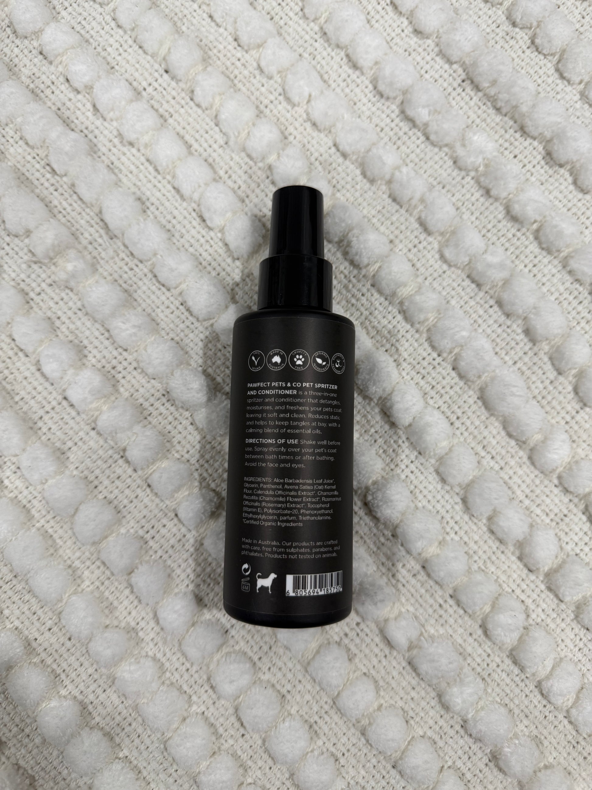 PAWFECT PETS & CO DOG SPRITZER AND CONDITIONER is a three-in-one spritzer, our Spritzer detangles, moisturizes and freshens your dog’s coat. The spray is ideal for after bathing or to freshen up in between baths. It will also reduce static and keep nasty tangles at bay!
