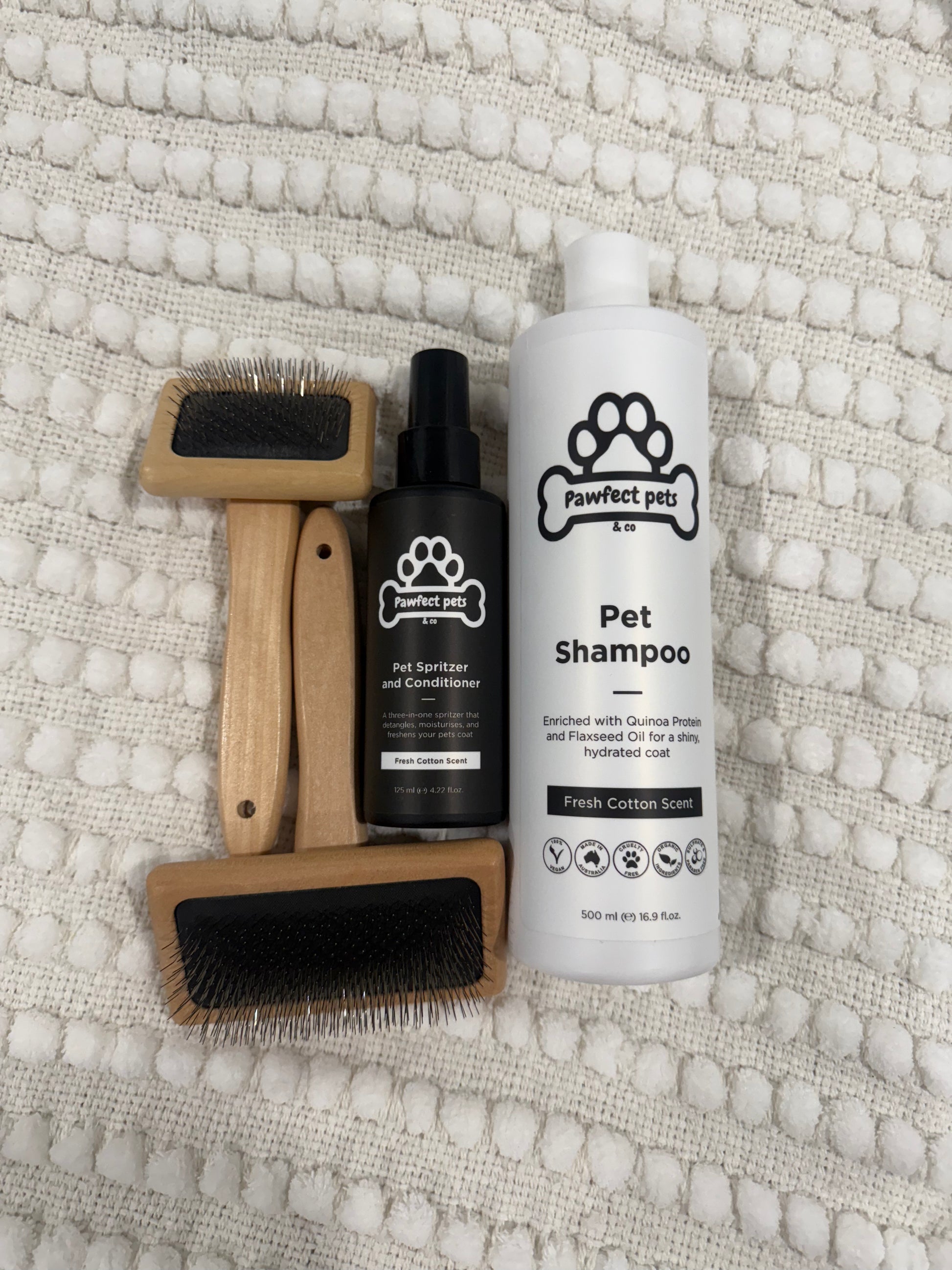Introducing the Ultimate Starter Set, meticulously curated for your furry friends. This set includes premium shampoo and conditioner, along with a small brush for precise grooming and a large brush for a thorough pampering session. Give your dogs the care they deserve with this comprehensive set. Order now and make grooming a joyous experience!